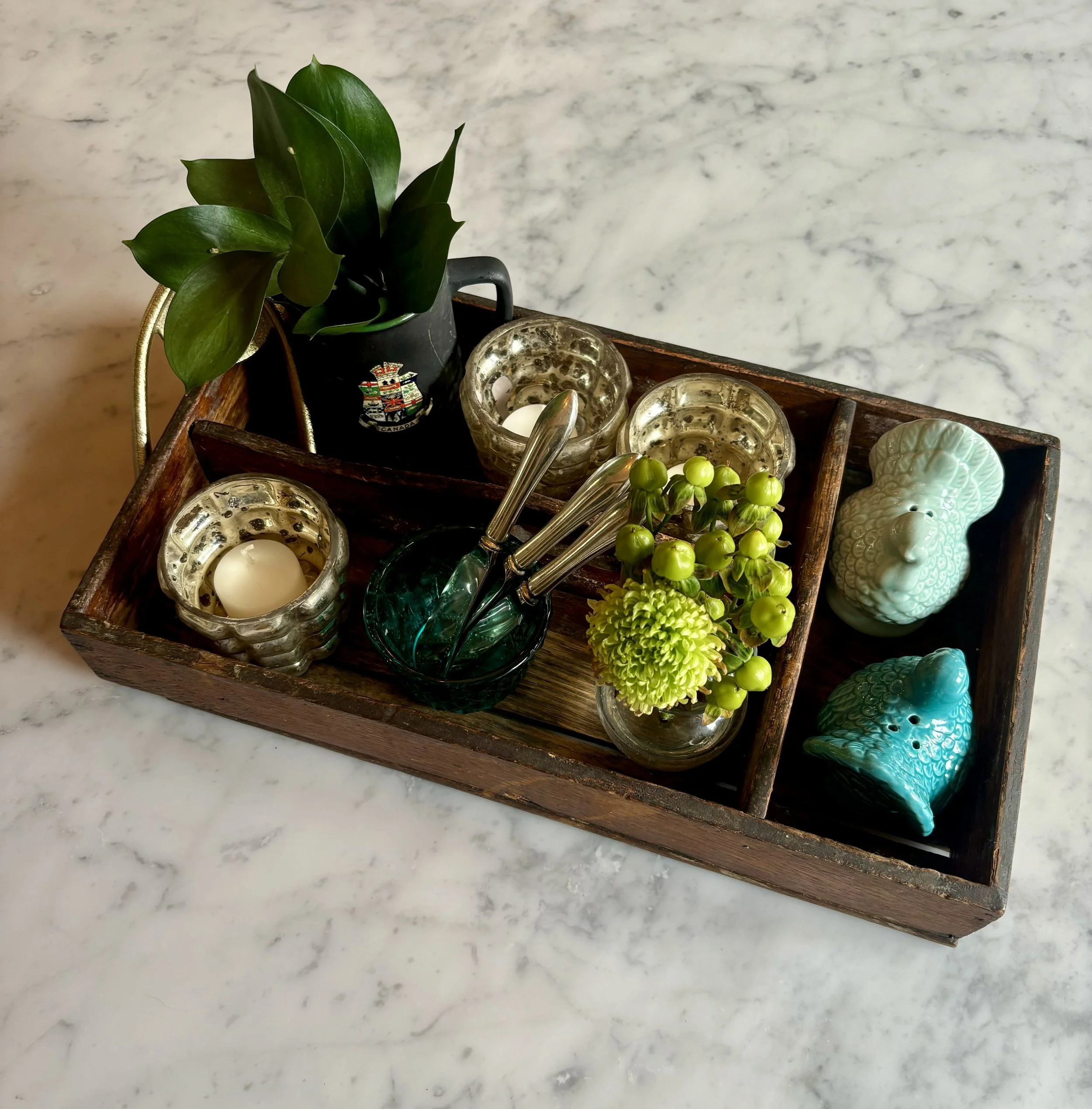 Use a large, low base to contain flowers, candles and decorative items. A basket, tray or wooden box looks intentional and provides instant order to keeps everything tidy. It can be long and narrow or wide and round and ideally should echo the shape of your table.