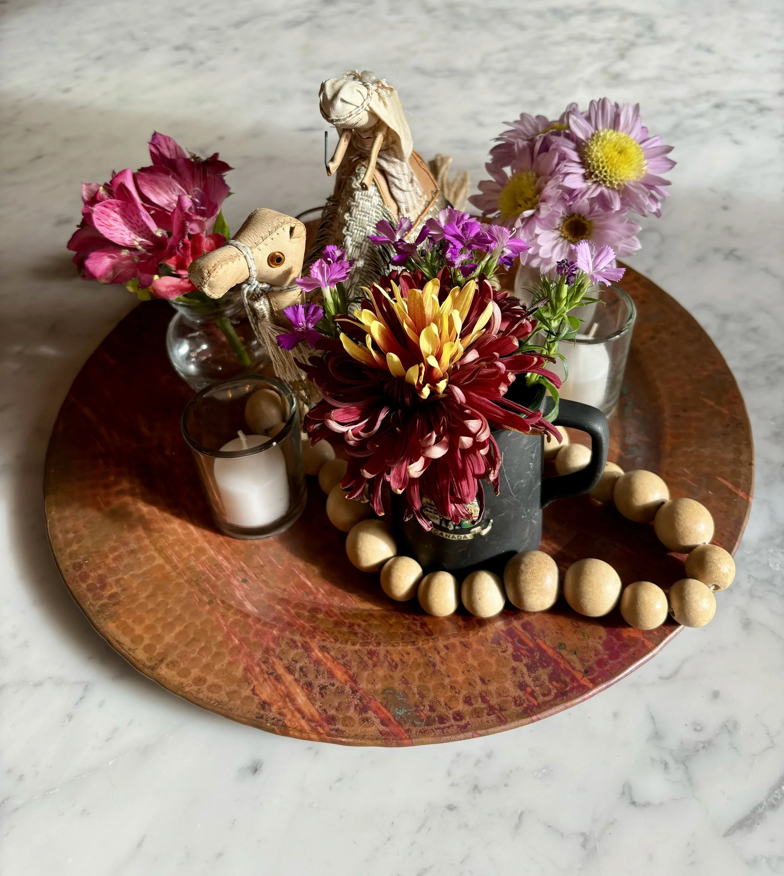 Introduce a favorite trinket or recent find that fits the color palette and grabs guests’ attention. I found the handcrafted leather camel and rider at an estate sale for maybe $6 and the salt and pepper shaker turkeys at Target for $3 (snap up some extras because these cuties are already selling on eBay for $20). They’re just interesting and fun, and in the case of the shakers, useful.