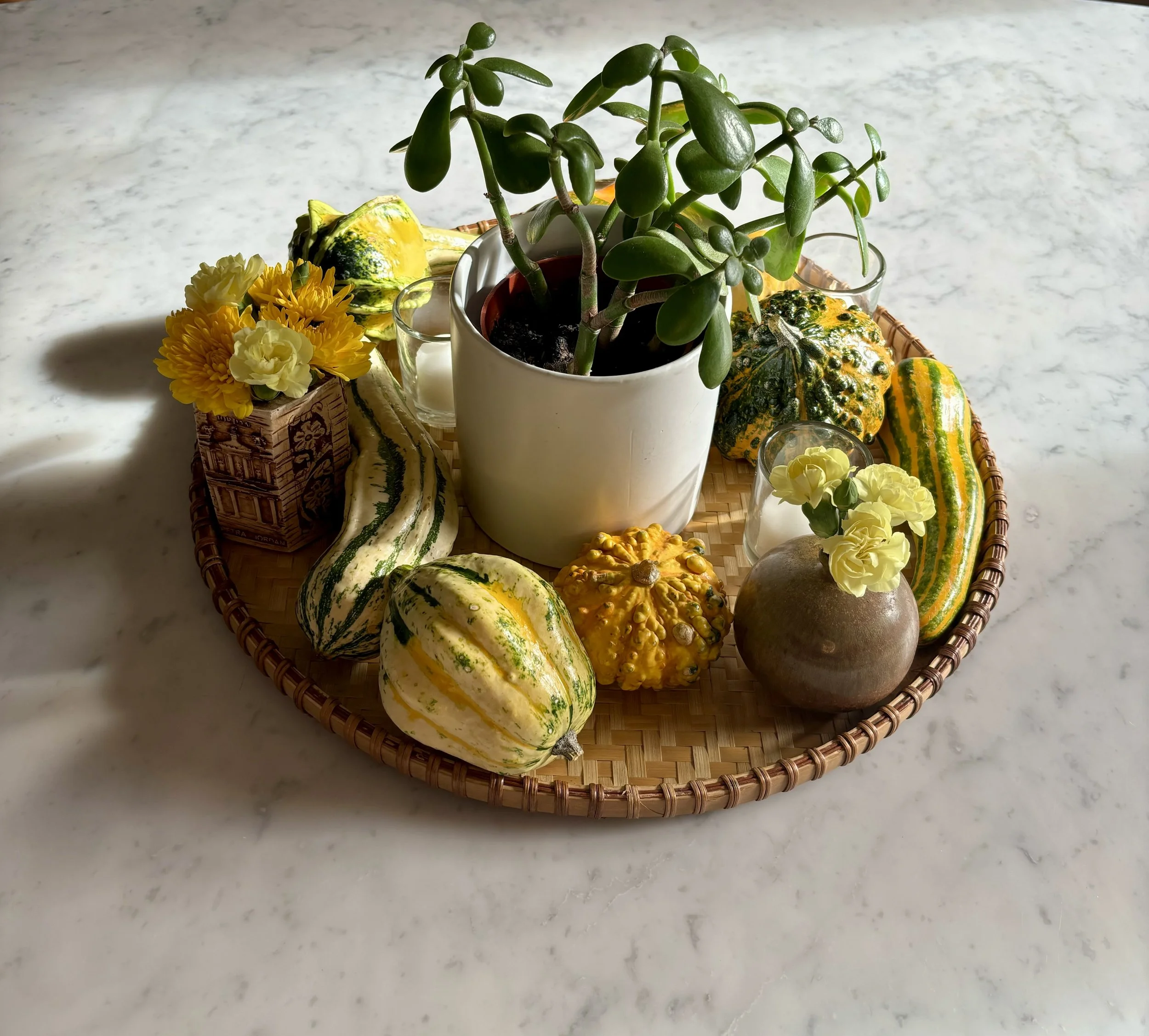 Build a centerpiece around a potted plant or several small succulents instead of flowers for something that can be used for weeks on end. I love Christmas cactuses and jade plants like the one shown with gourds because they require little care and my cats don’t try to eat them!